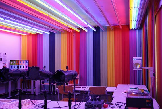 Das Farb-Licht-Studio erlaubt verschiedene Einblicke in die Wirkungsweise des Lichtes auf Farben. Unter anderem werden Experimente mit farbigen Schattenbildern durchgeführt. Den Schülerinnen und Schülern und unseren Studierenden wird ein Gefühl für andere Dimensionen der Farbe vermittelt.