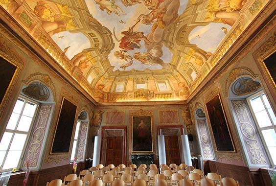 Mit Stolz dürfen wir sagen, dass uns ein wahres barockes Juwel zur Verfügung steht. Architektur und Freskomalerei lassen sich in das 1. Viertel des 18. Jahrhunderts einordnen. Also in eine Zeit, als Schloss Leesdorf im Besitz von Stift Melk war und die romanische Wasserburg entsprechend barockisiert wurde. Das Gesamtkunstwerk Rittersaal ist heute der Festsaal der Schule. Ein anregender und faszinierender Raum, den wir nun technisch adaptiert, zeitgemäß nützen. Unterricht, Vorträge, Seminare und Abschlussprüfungen finden hier in einem besonderen Rahmen statt. Jährliche Höhepunkte sind die feierlichen Zeugnisverleihungen an unsere Absolventinnen und Absolventen, die sich seit Generationen dann stolz Leesdorferinnen und Leesdorfer nennen.